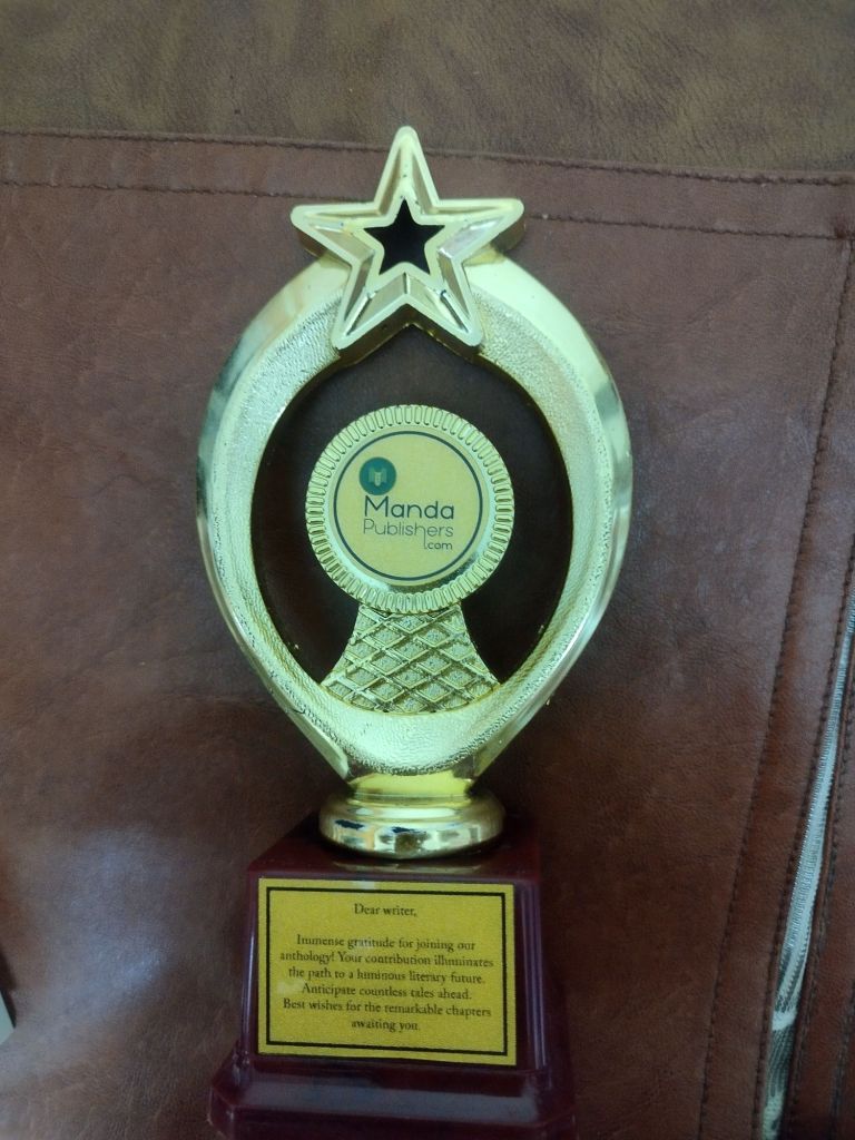 My first anthology ( Poetry) ultimately in my hand with a magnificent trophy from the publisher as recognition.