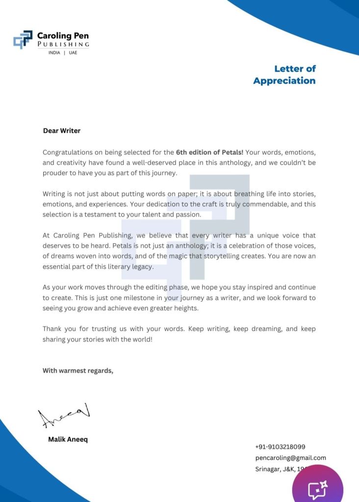 Letter of appreciation :My writing is accepted for publication in the 6 th edition of Petal by Carolling pen